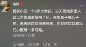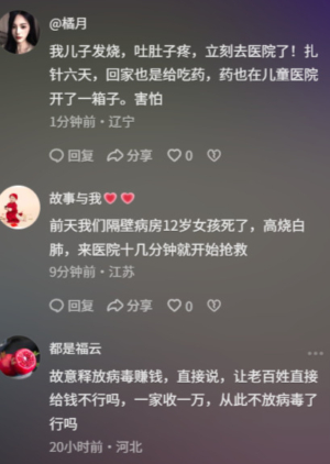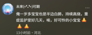 「俺一歲多寶寶也是半邊白肺,持續高燒,重症監護室好幾天。」「我們也是合併感染,發燒感冒、咳嗽、肚子疼。」「我家小區一個8歲小女孩,白天發燒家裡人就以為普通發燒餵了藥,夜裡孩子喊肚子疼,再去醫院沒搶救過來,而且醫院就和我們小區隔一條馬路。」「前天我們隔壁病房12歲女孩死了,高燒白肺,來醫院十幾分鐘就開始搶救。」