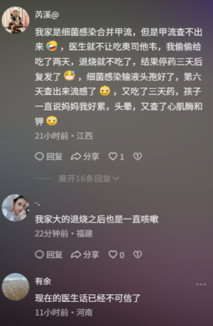 「我小孩班裡前天請假18個,昨天17個,今天19個,只增不減啊,我女兒年級隔壁班剩下五個人直接停課。」「我兒子發燒,肚子疼,立刻去醫院了!扎針六天,回家也是給吃藥,藥也在兒童醫院開了一箱子,害怕。」「我兒子今天下午也檢查甲流,三天去了三個醫院。」