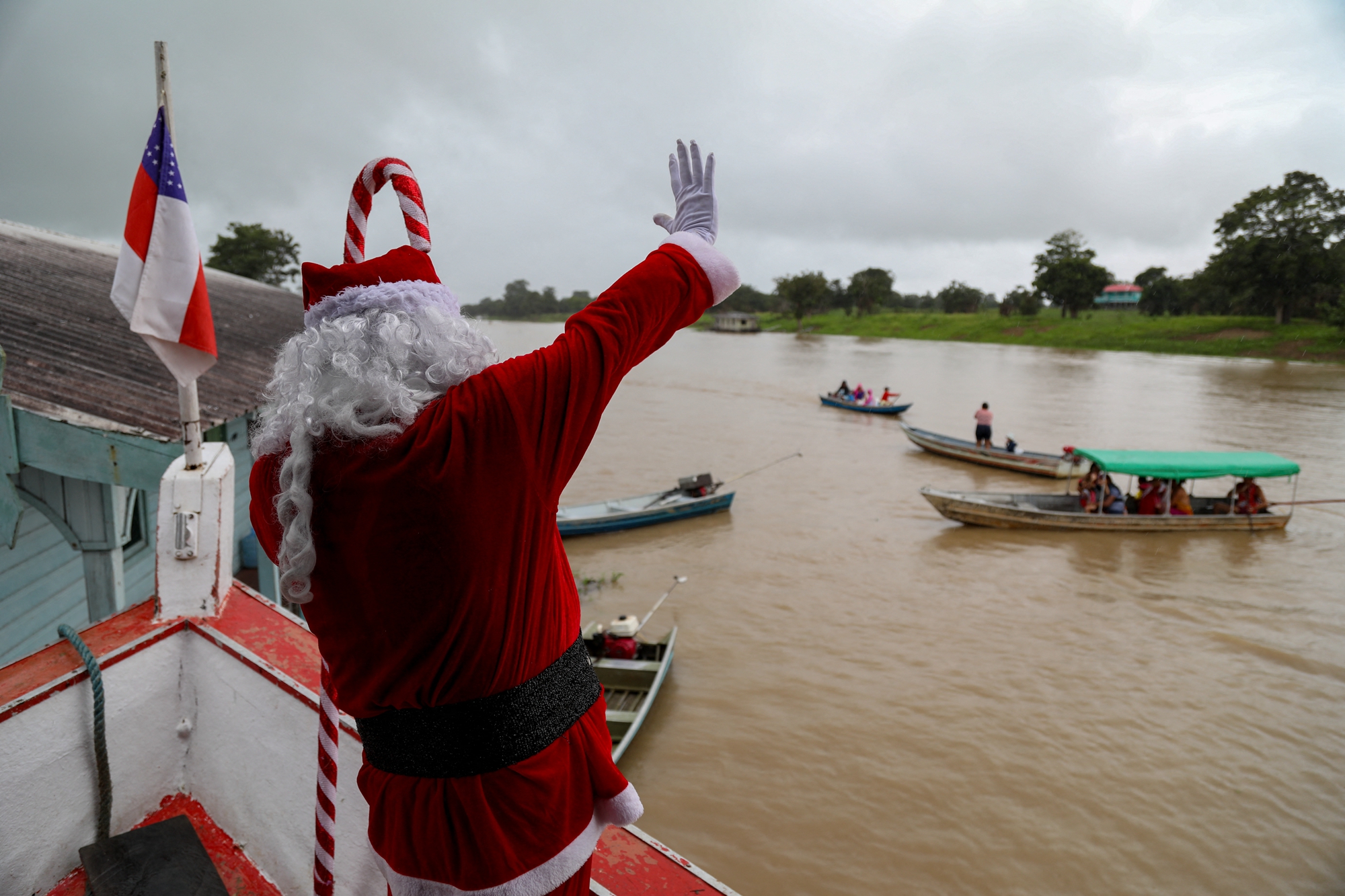 2025年12月20日,志願者豪爾赫·阿爾貝托·巴羅佐(Jorge Alberto Barrozo)裝扮成聖誕老人,乘坐船隻抵達巴西亞馬遜州卡雷羅達瓦爾澤亞(Careiro da Varzea)農村地區,向當地兒童派發禮物。圖為聖誕老人在船上向當地居民揮手致意。(Michael Dantas/AFP via Getty Images)