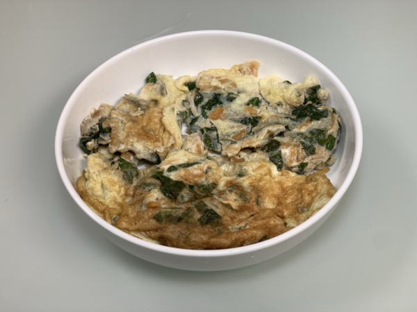將雞蛋打散、紫蘇葉切細與蛋液拌勻,加入乾貝絲。小火慢煎至兩面微黃。