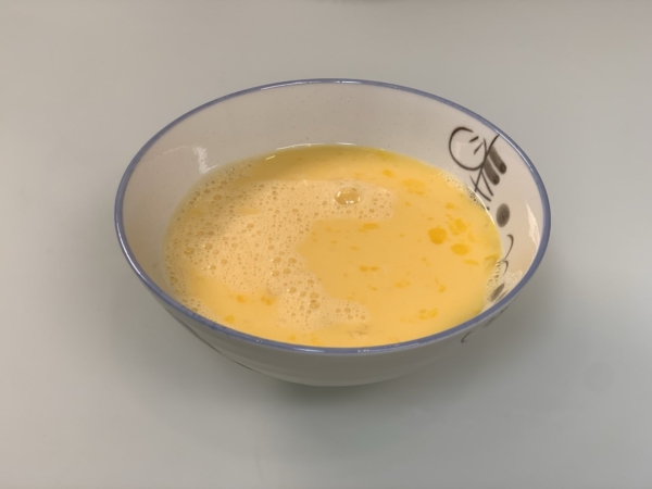 將雞蛋打散、紫蘇葉切細與蛋液拌勻,加入乾貝絲。(圖/曲直)