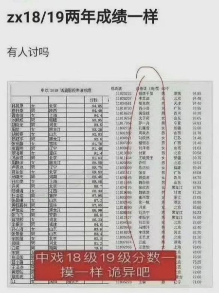 近日網傳的一份藝考成績單顯示,2018年,中戲明星藝考生扎堆,有易烊千璽、李蘭迪、胡先煦、羅一舟等,藝考成績排名順序也順著各自的知名度;2019年,明星藝考生也不少。仔細看兩年的分數表,發現整個成績單的分數都一樣,連小數點都一致,看起來像是只改了姓名、籍貫和性別,分數就像是複製粘貼。