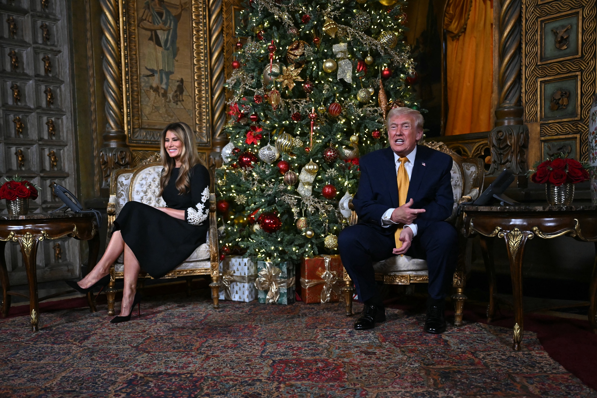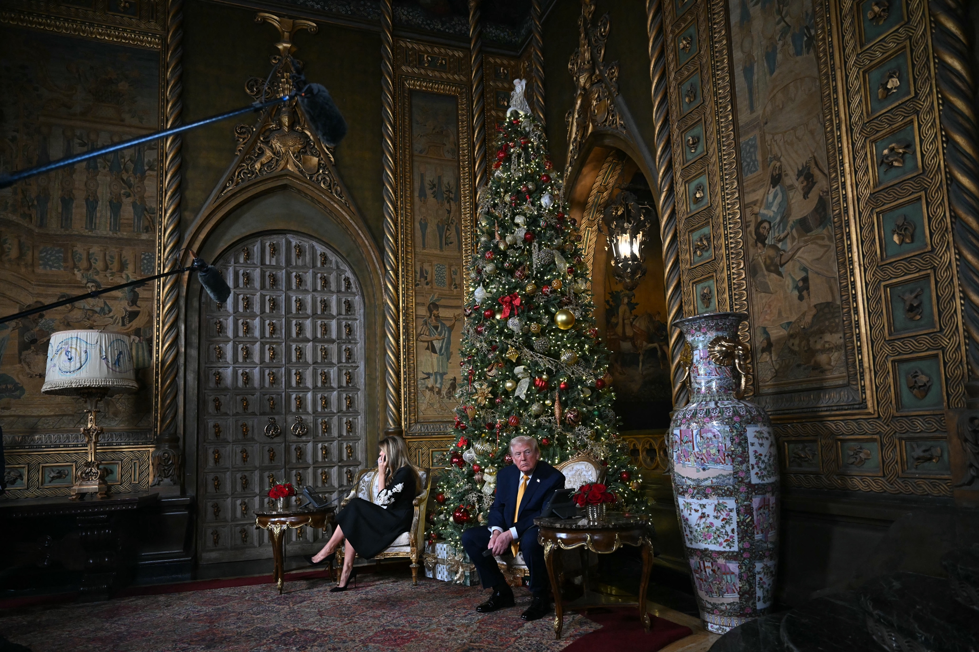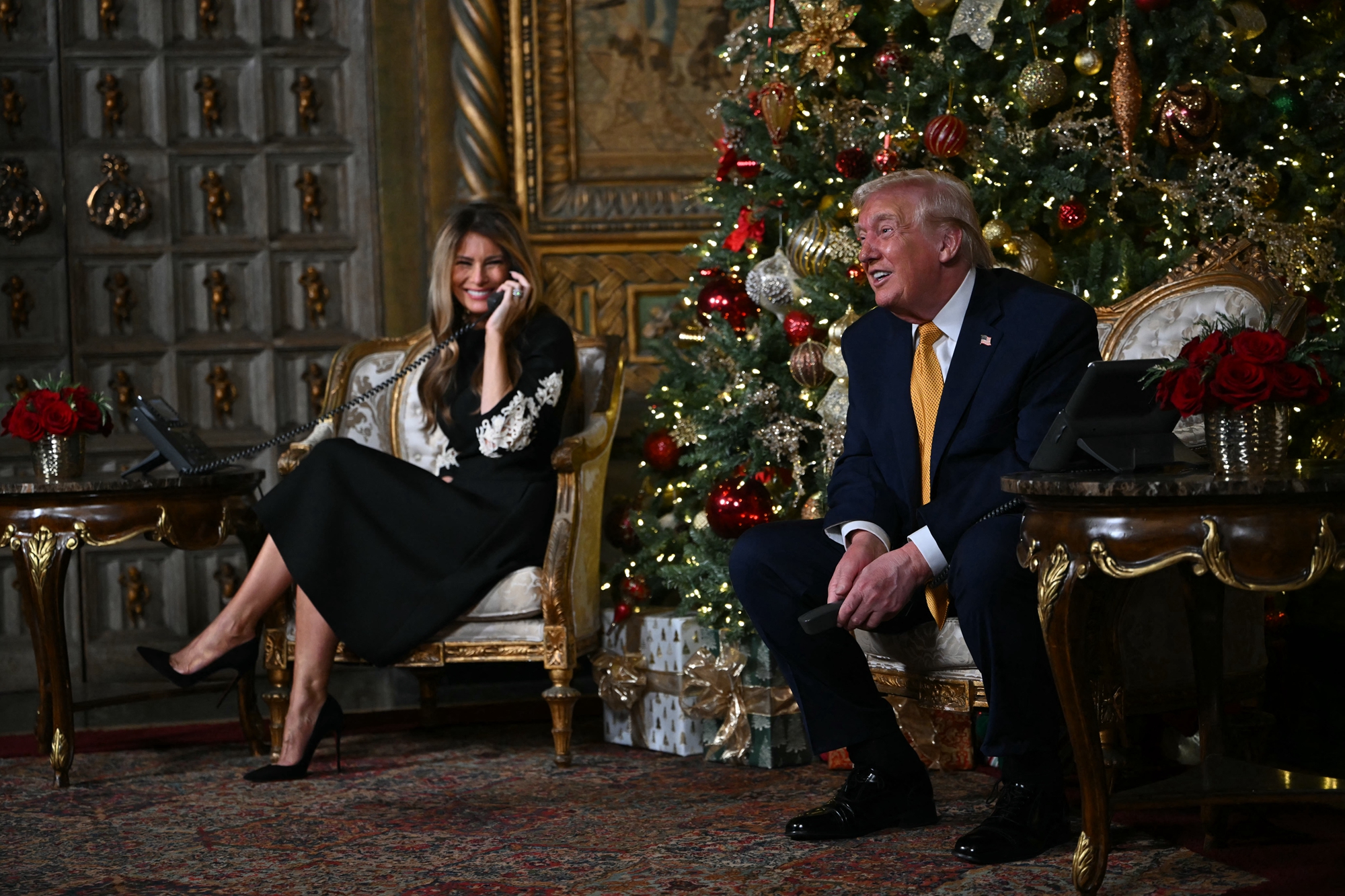 2025年12月24日平安夜,美國總統川普與第一夫人梅拉尼婭在佛羅里達州棕櫚灘的海湖莊園,參與北美防空司令部(NORAD)「追蹤聖誕老人」活動,親自接聽全美各地兒童打來的電話。(Tasos Katopodis/Getty Images)