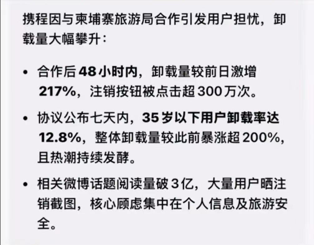 另有流傳截圖顯示,在攜程與柬埔寨旅遊部門合作訊息公布後一段時間內,部分年輕用戶的卸載比例出現上升趨勢。相關圖表未標示數據來源,真實性無法獨立核實,但在網絡上被反覆引用,討論熱度仍在延續。