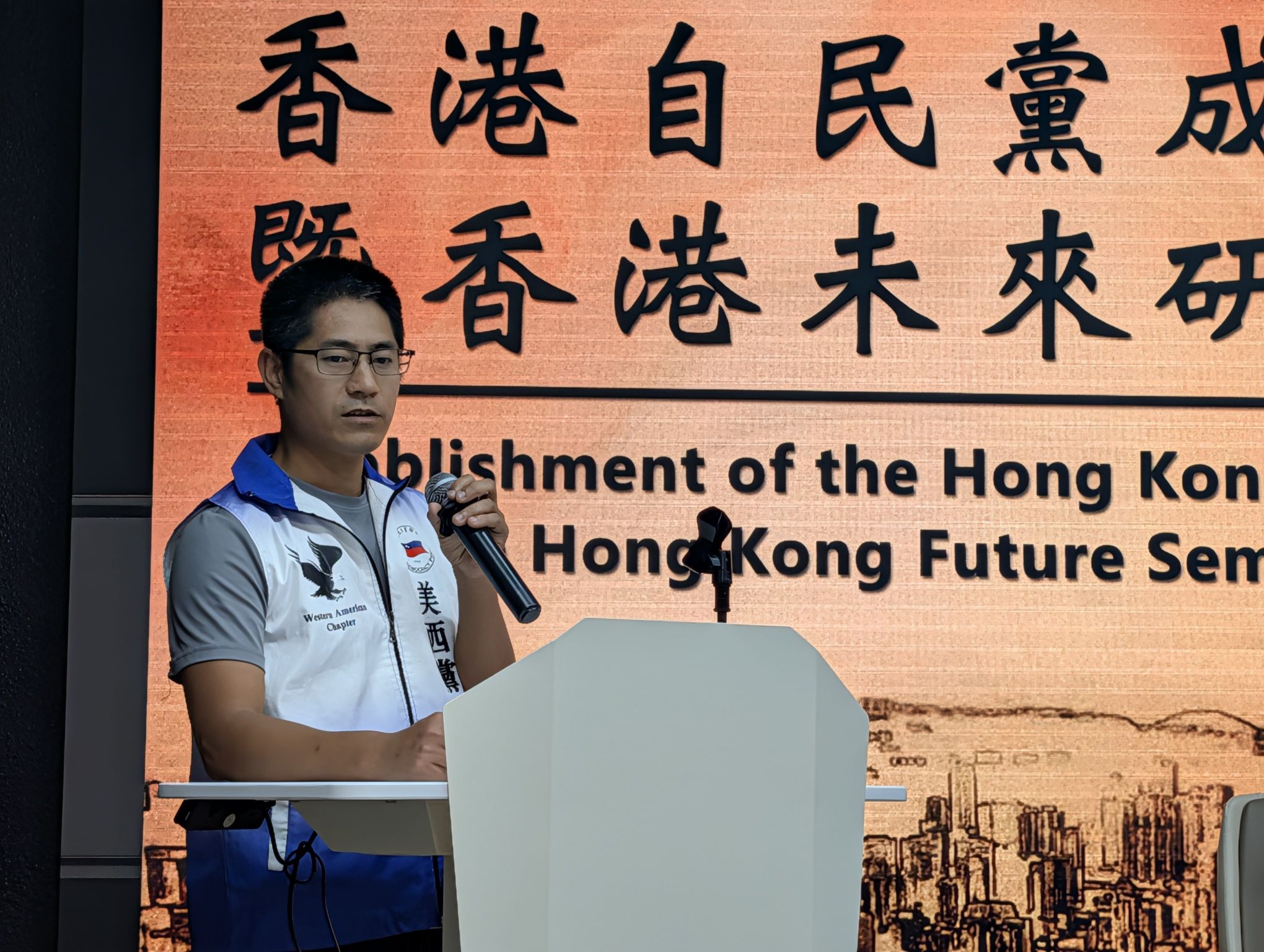 2025年12月27日,流亡美國的香港人創立香港自民黨。中國民主黨聯合總部、自由鐘民主基金會成員到場聲援。圖為香港移民發言。(陳德怡/大紀元)
