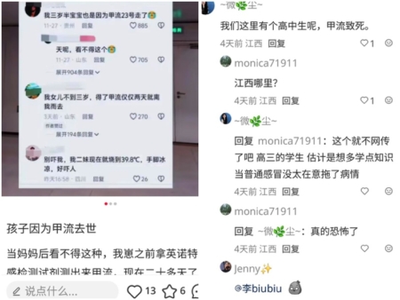 貴州的一位家長上個月底時在甲流死亡的討論群介紹,「我三歲半寶寶也是因為甲流23日走了。」