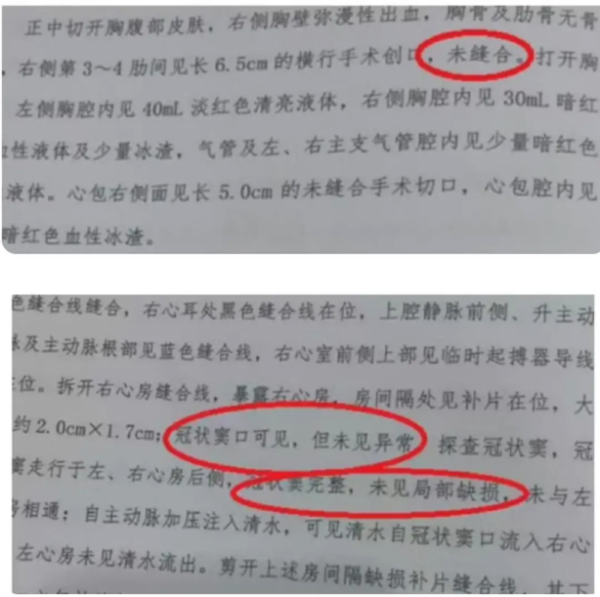 此外,她公布的部分屍檢報告還顯示,「正中切開胸腹部皮膚,右側胸壁瀰漫性出血,右側第3—4肋間見長6.5cm的橫行手術創口,未縫合。」「剪開上述房間隔缺損補片縫合線,其下見另一心包補片部分在位,未覆蓋房間隔缺損全部,一側縫合於房間隔缺損下後緣處,另一側游離狀,大小約為1.4cm×0.5cm,房間隔缺損大小為 1.0cm×0.9cm。」家屬質疑實施手術人員未對孩子的傷口進行縫合,且將手術補片留在了孩子的心臟中。