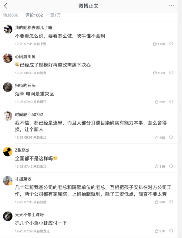 對此,大陸網民紛紛嘲諷:「不要看怎麼說,要看怎麼做,吹牛誰不會啊。」「我不信,都已經是連帶,而且大部分耳濡目染確實有能力本事,怎麼捨得換,讓個新人。」「全國都不是這樣嗎?」「抓幾個小魚小蝦應付一下。」「近親繁殖就算了,勞務派遣才是最大的問題。」「光是國企嗎?事業單位也看看!」「演給你們看的,想整治還不容易,說得很難發現一樣。」