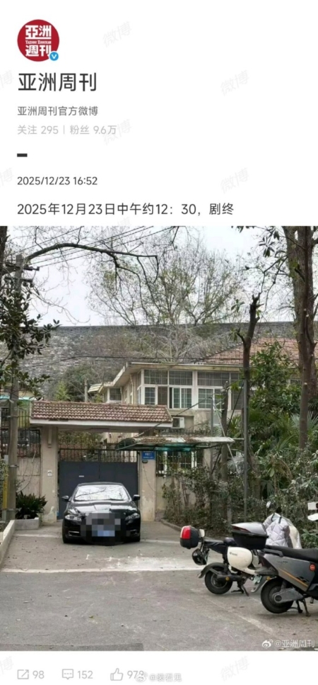 「扎西德勒‧天珠收藏」說,「事實上,《亞洲週刊》早在12月23日下午近5點時,就已發布過一條耐人尋味的微博。這條微博配文『2025年12月23日中午約12:30,劇終』,並附上了一張徐湖平別墅的照片。值得關注的是,這套別墅距離南京博物院非常近,且本身還是一處受國家保護的文物建築。照片中,別墅門前停放著一輛黑色小轎車,這張圖片與簡短的配文當時便引發了網友的諸多猜測,有人推測這輛車是政府部門的辦案車輛,也有不少人疑惑,難道是徐湖平因身體原因被送往醫院?如今結合鄰居的爆料來看,這場『劇終』所指向的,顯然是調查行動的正式啟動。」