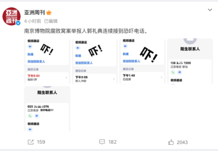 12月24日,《亞洲週刊》在其官方微博中透露,「南京博物院腐敗窩案舉報人郭禮典連續接到恐嚇電話。」