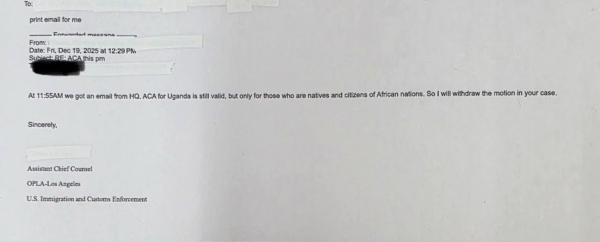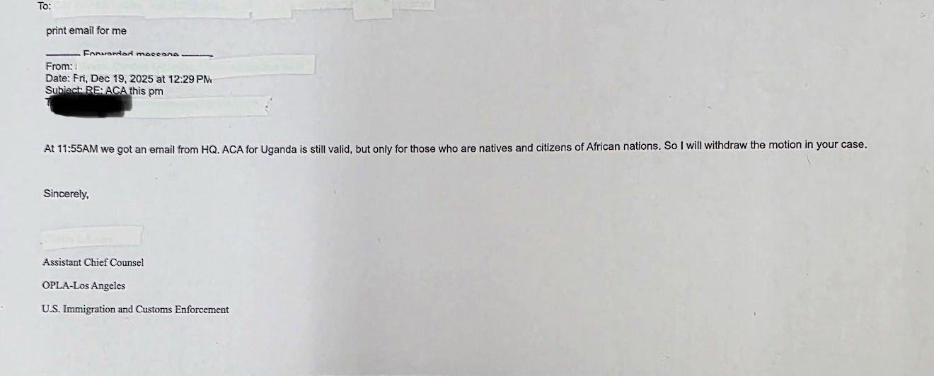 洛杉磯環球律師事樓法律博士鄭存柱告訴大紀元記者,該所移民律師週五下午收到DHS的郵件,申明美國與烏干達的「安全第三國」協議(ACA)依然有效,但只針對非洲國家的原住民和公民;此前發出針對中國人的遞解至烏干達的動議將取消。