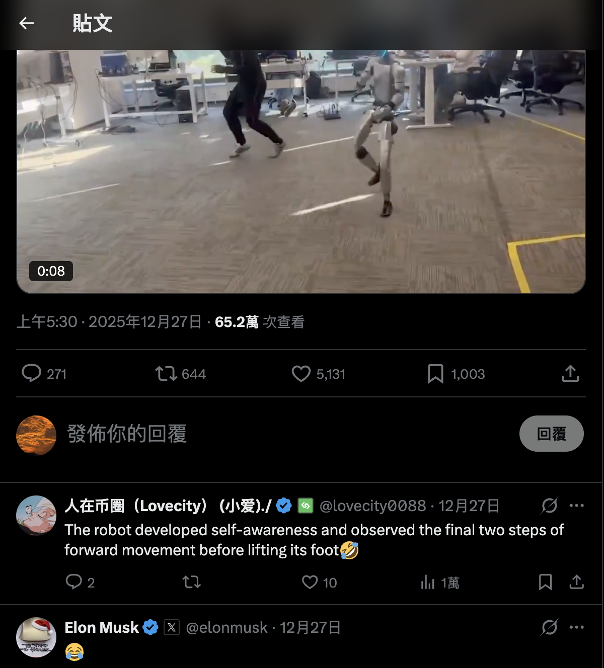 特斯拉首席工程師韋斯・莫里爾12月26日轉發了該視頻,馬斯克在評論區留下「爆笑」表情符號。