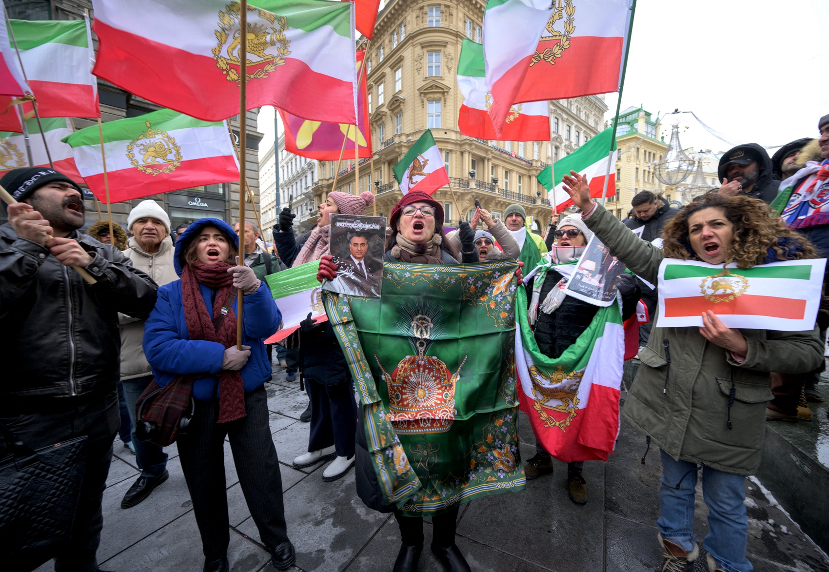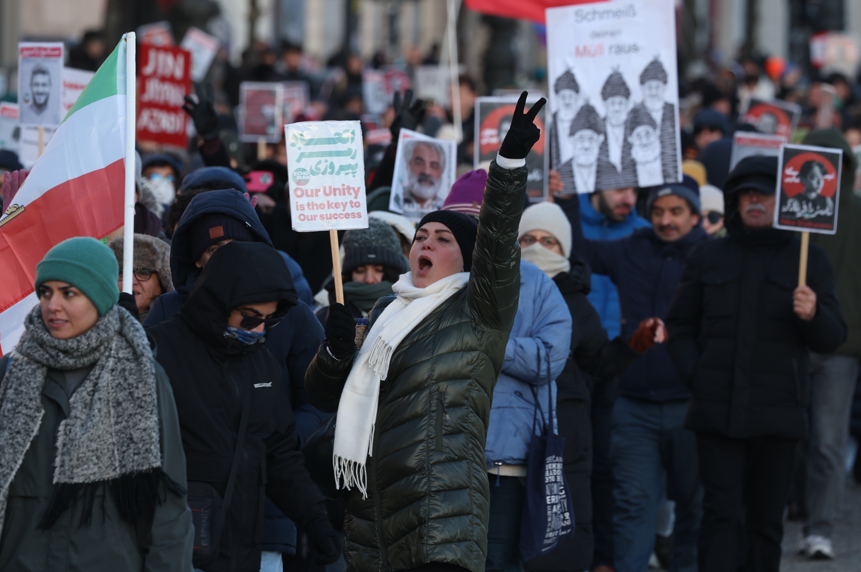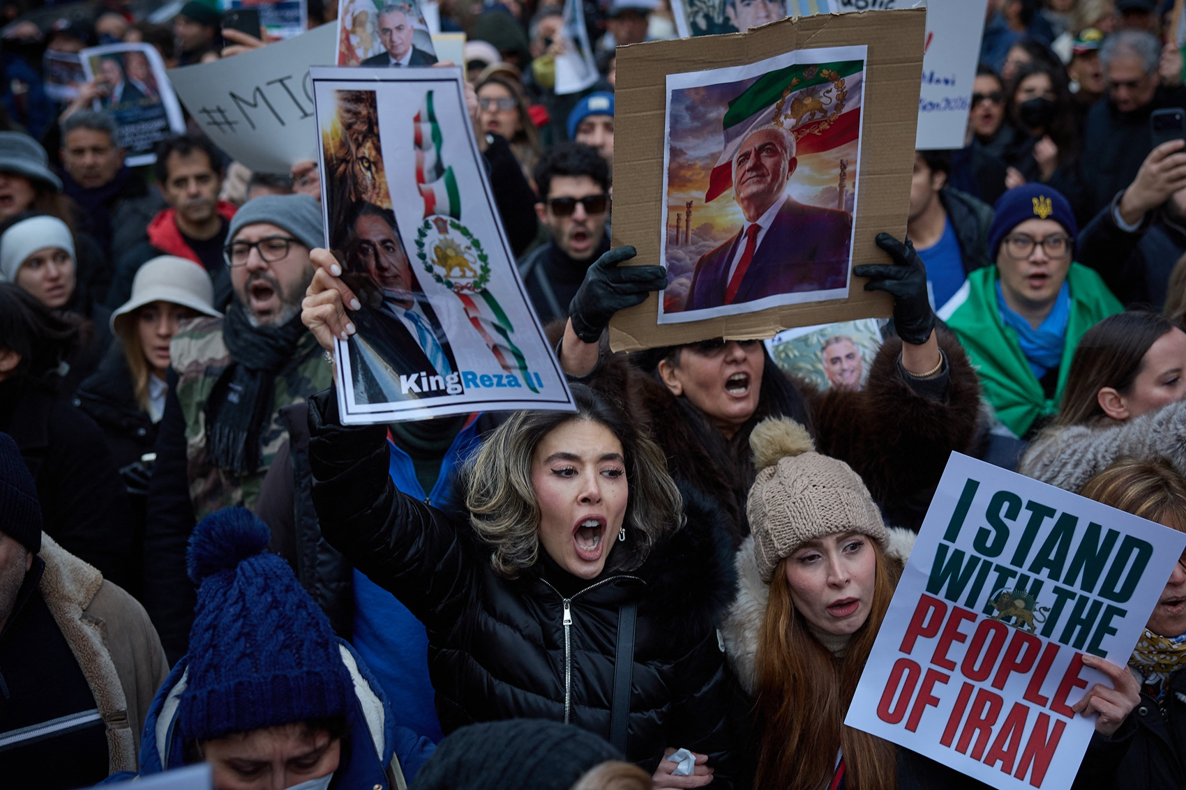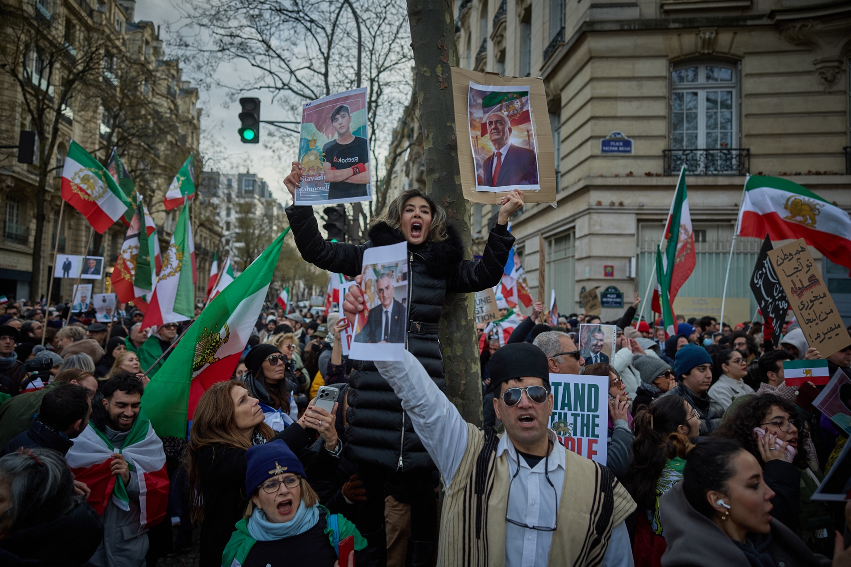 在巴黎,超過2000人揮舞著1979年伊朗革命之前的獅子太陽旗,在示威現場高喊「拒絕恐怖分子的伊朗伊斯蘭共和國(Islamic Republic of Iran)」。