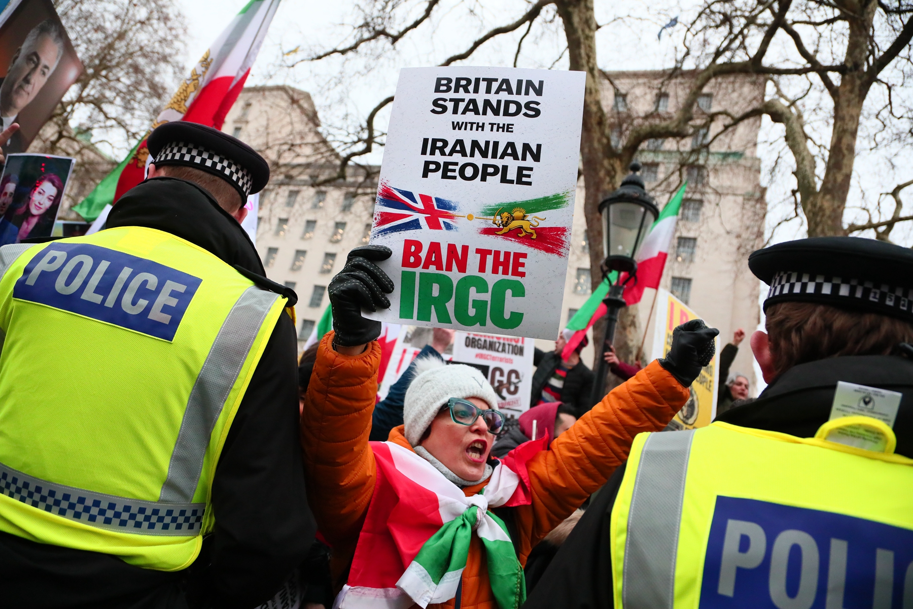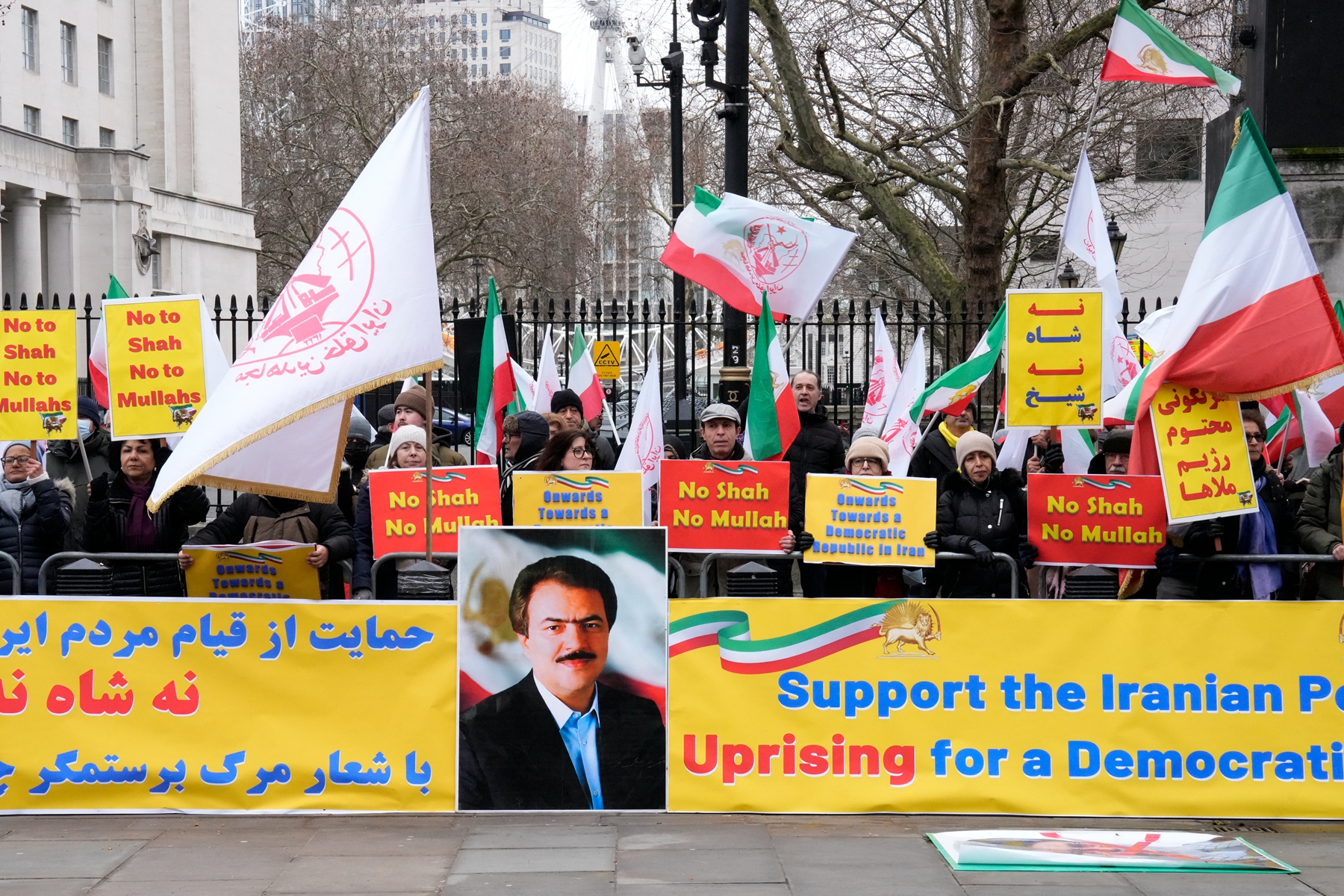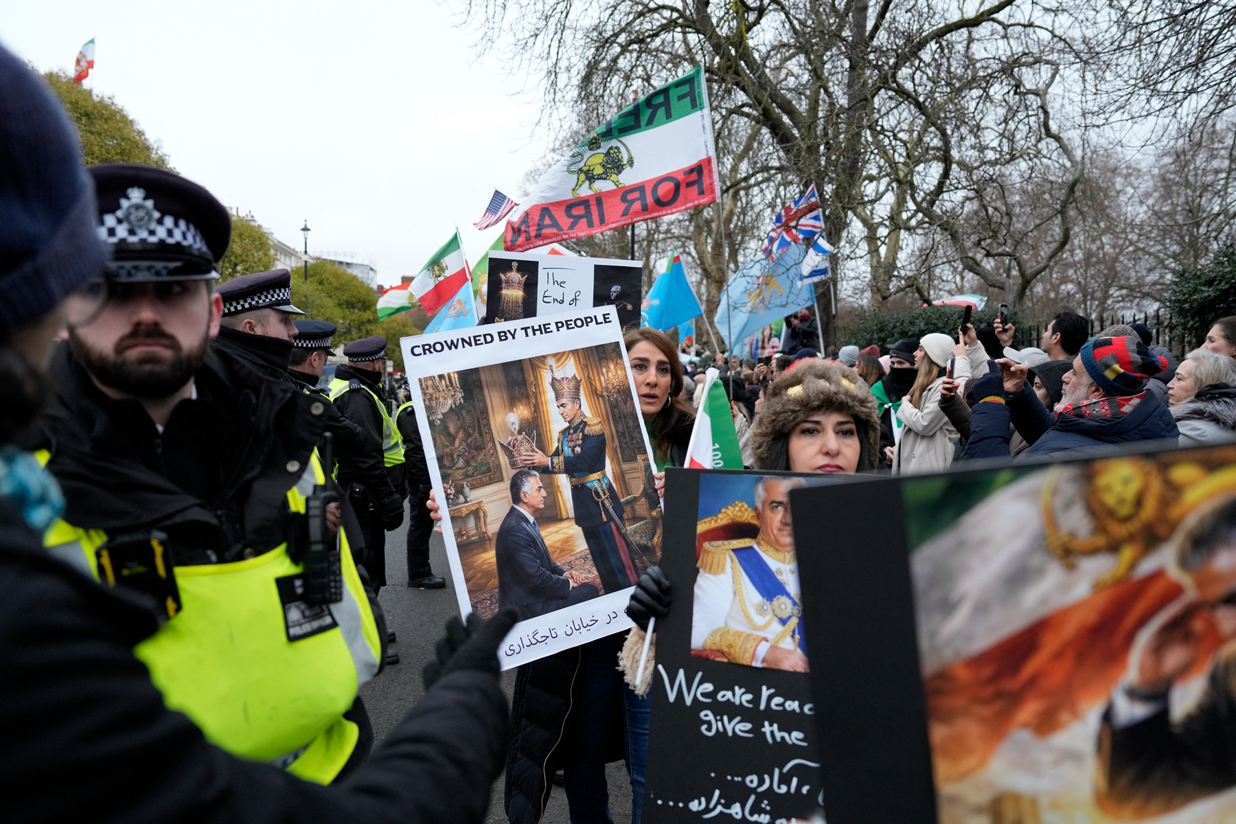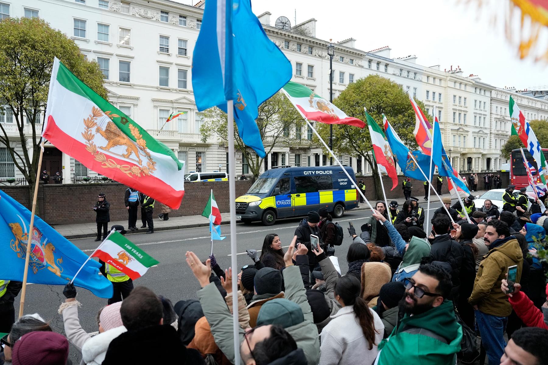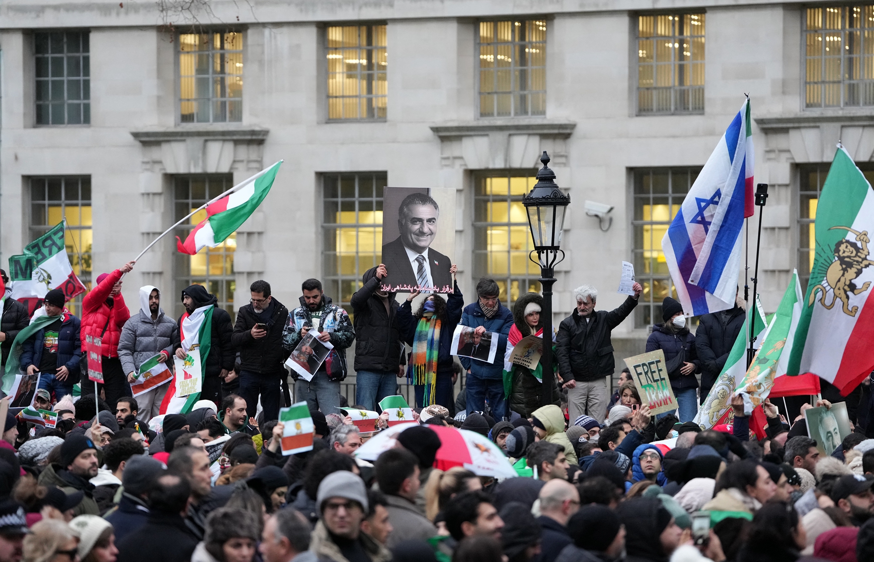 在倫敦,聲援民眾最初在伊朗大使館前聚集,後來移至英國首相官邸外面,隨著時間的推移,參與人數增加到數千人。現場飄揚著支持流亡美國的伊朗末代王儲禮薩·巴列維的旗幟。