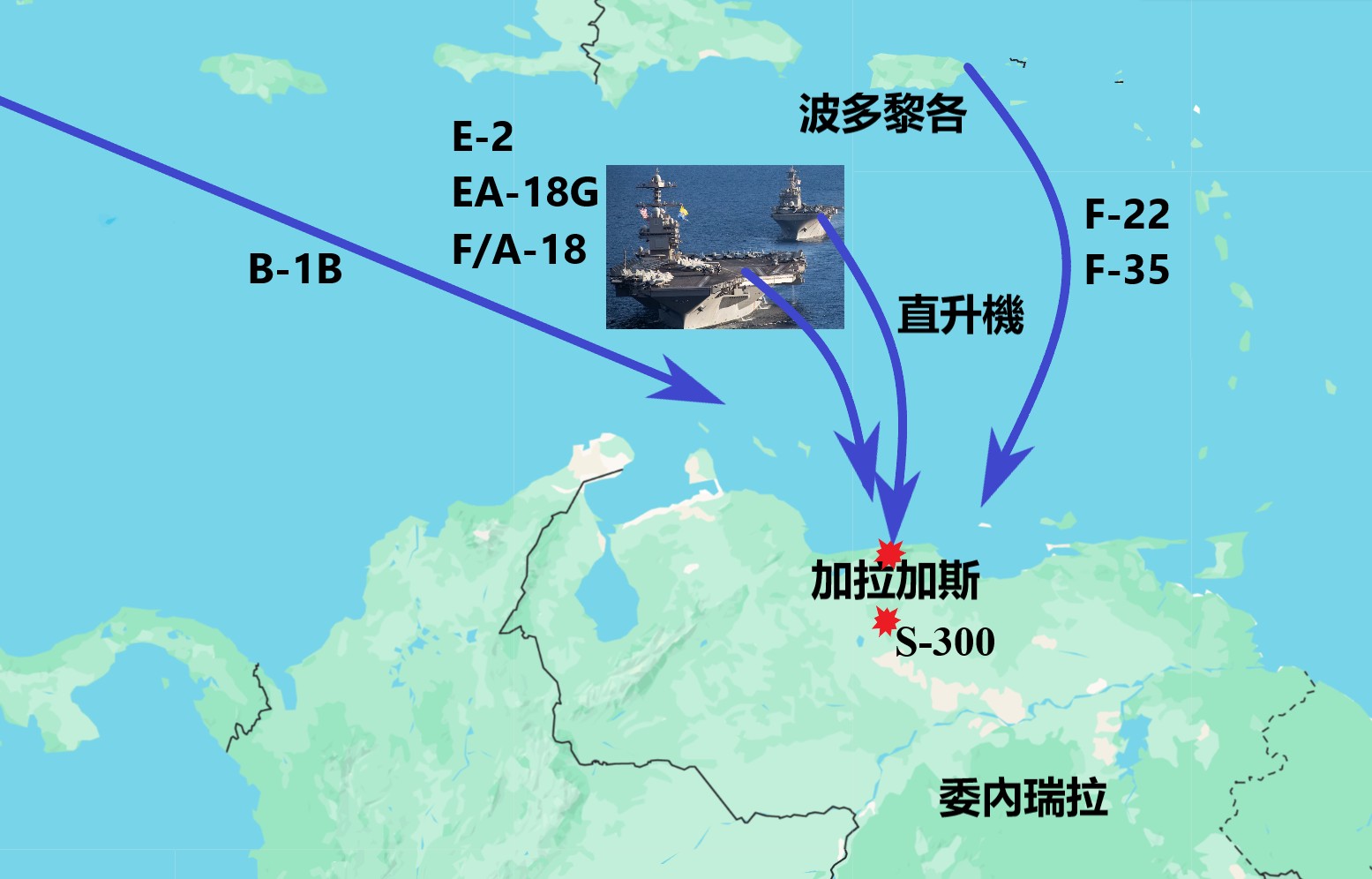 美軍的F-22、F35戰鬥機等提前部署在波多黎各,距離委內瑞拉的加拉加斯不到900公里。飛機接近委內瑞拉300公里範圍時,中共的JY-27米波雷達理論上應能發現行蹤。但實際上美軍戰機如入無人之境。