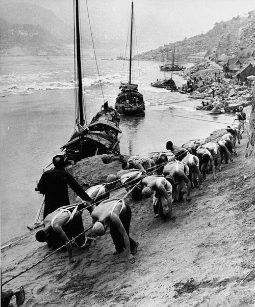 當年,河上百舸爭流,煤、木材、農副產品和日用品全靠船隻運進運出,縴夫在那時就起著關鍵性的作用。他們屈著身子,背著僵繩,步態一瘸一拐的往前邁。有許多縴夫拉縴的時候是不穿衣服的,暮春、夏季、初秋等溫暖的時節多是光著身子,即使面對大姑娘也是泰然自若。