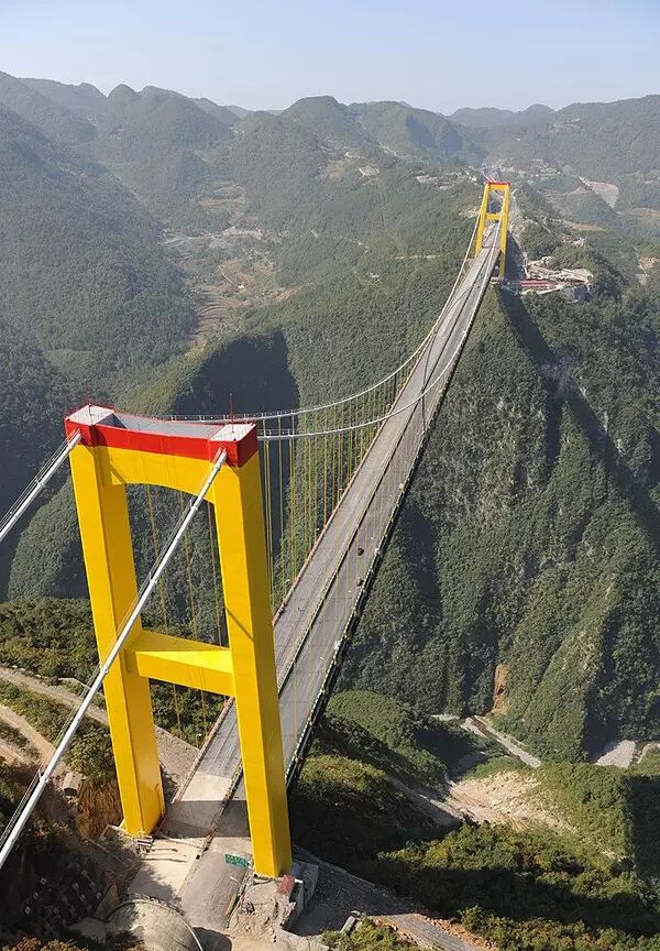 大橋全長1365米,由長1105米的大橋和長228.9米的路基組成。塔頂至峽谷谷底高差達650米,橋面距谷底560米,相當於200層樓高。200層樓啊,不是兩層樓啊!