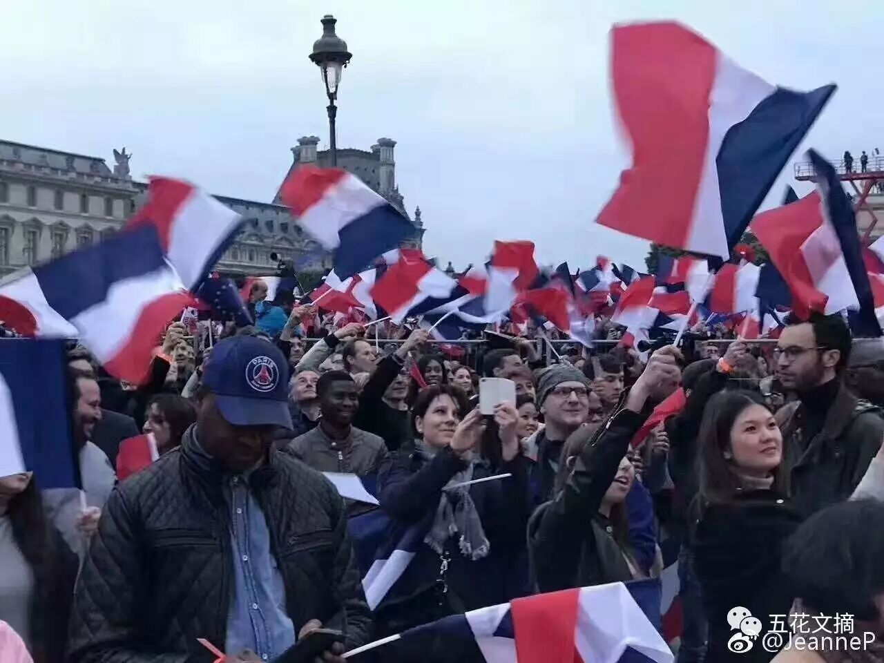有约6万到7万民众聚集在卢浮宫广场庆祝马克龙当选