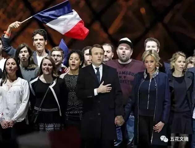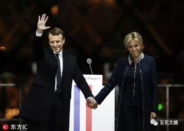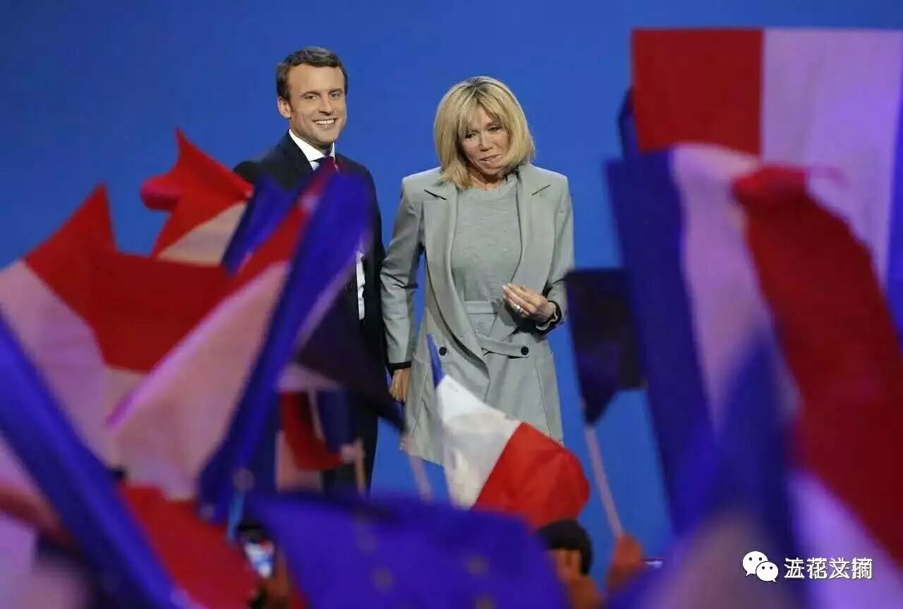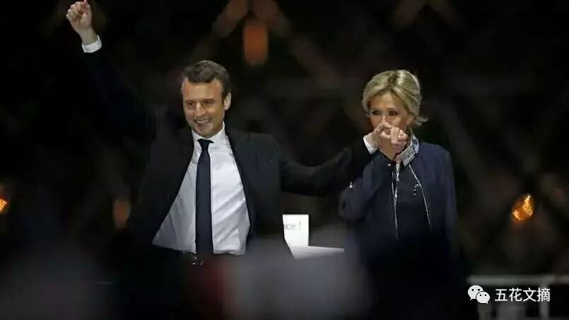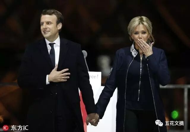 马克龙携手妻子庆祝胜利