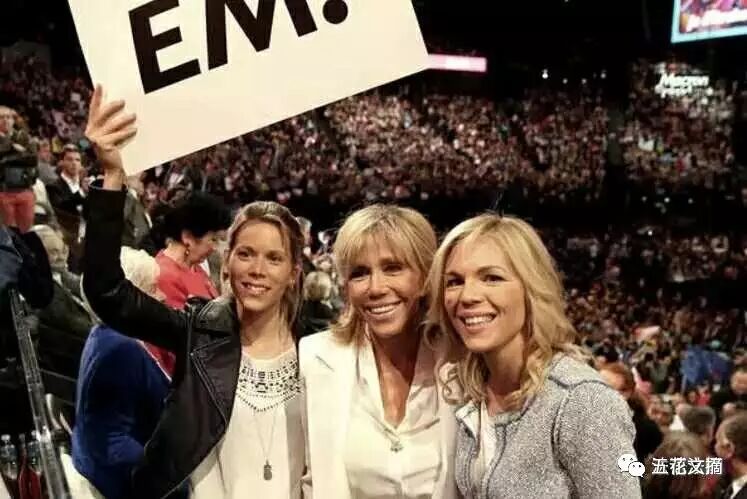 布里吉特和女儿(也是马克龙高中的同班同学)一起看台上的马克龙。