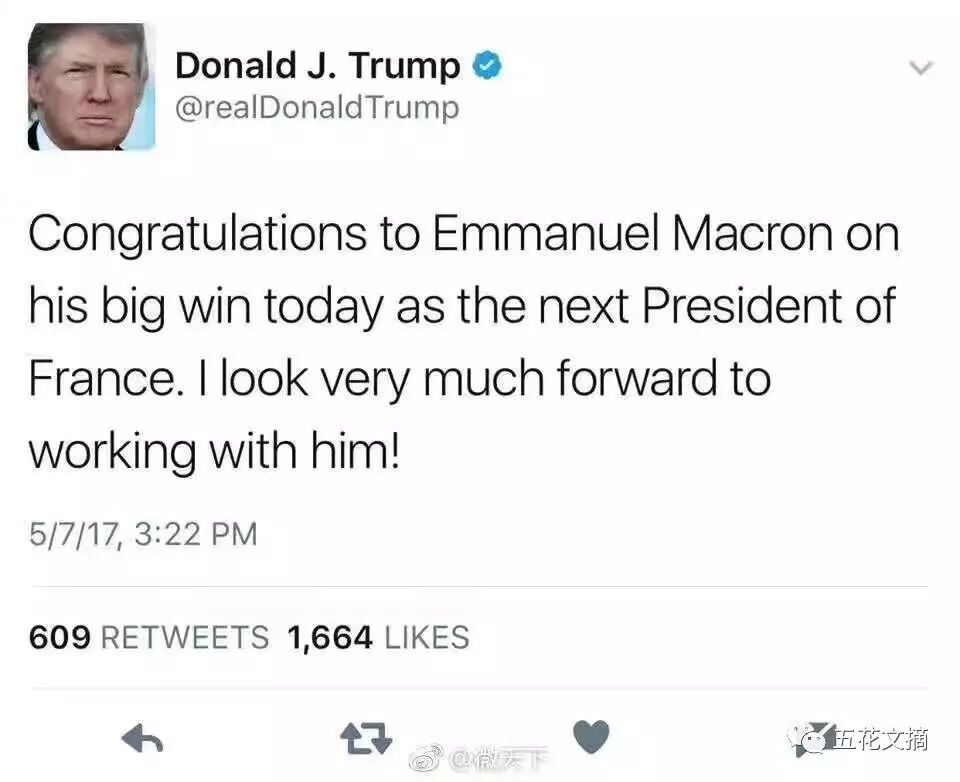 马克龙当选后,川普发推恭贺,称这是个“大胜利”,说自己“非常期待和他一起合作”。之前川普虽然没有明确表态,但曾称赞勒庞在边境和移民管理上的强硬态度。