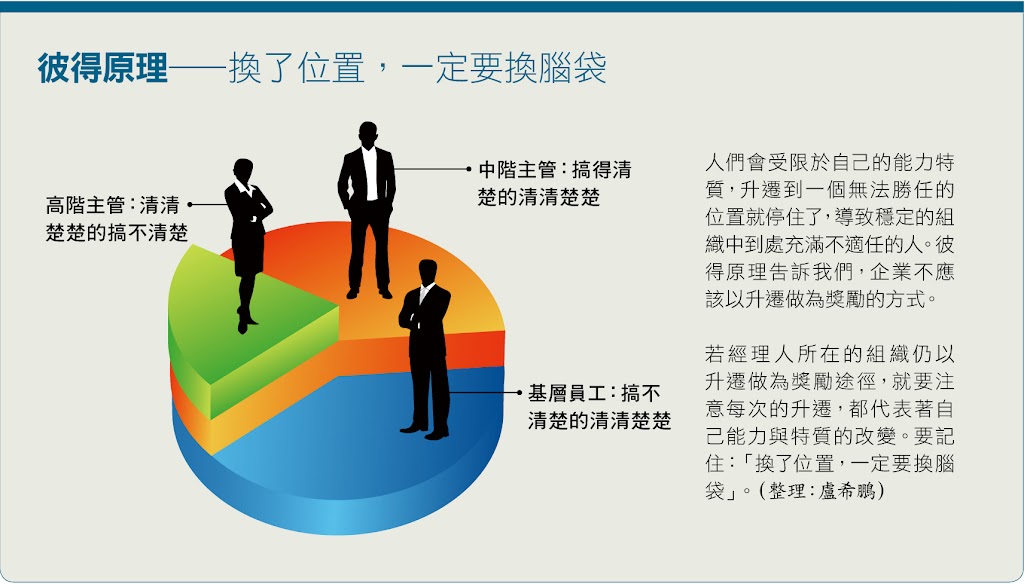 通常基層員工之所以優秀,是因為他注意瑣碎事務的邏輯關係;但高階主管之所以成功,是因為他強調直覺的人際關係。如果升遷後自己的特質沒有改變,可能就會成為下一個彼得原理的產物。或許,對一個升遷的經理人而言,「換了位置,一定要換腦袋」是很重要的。