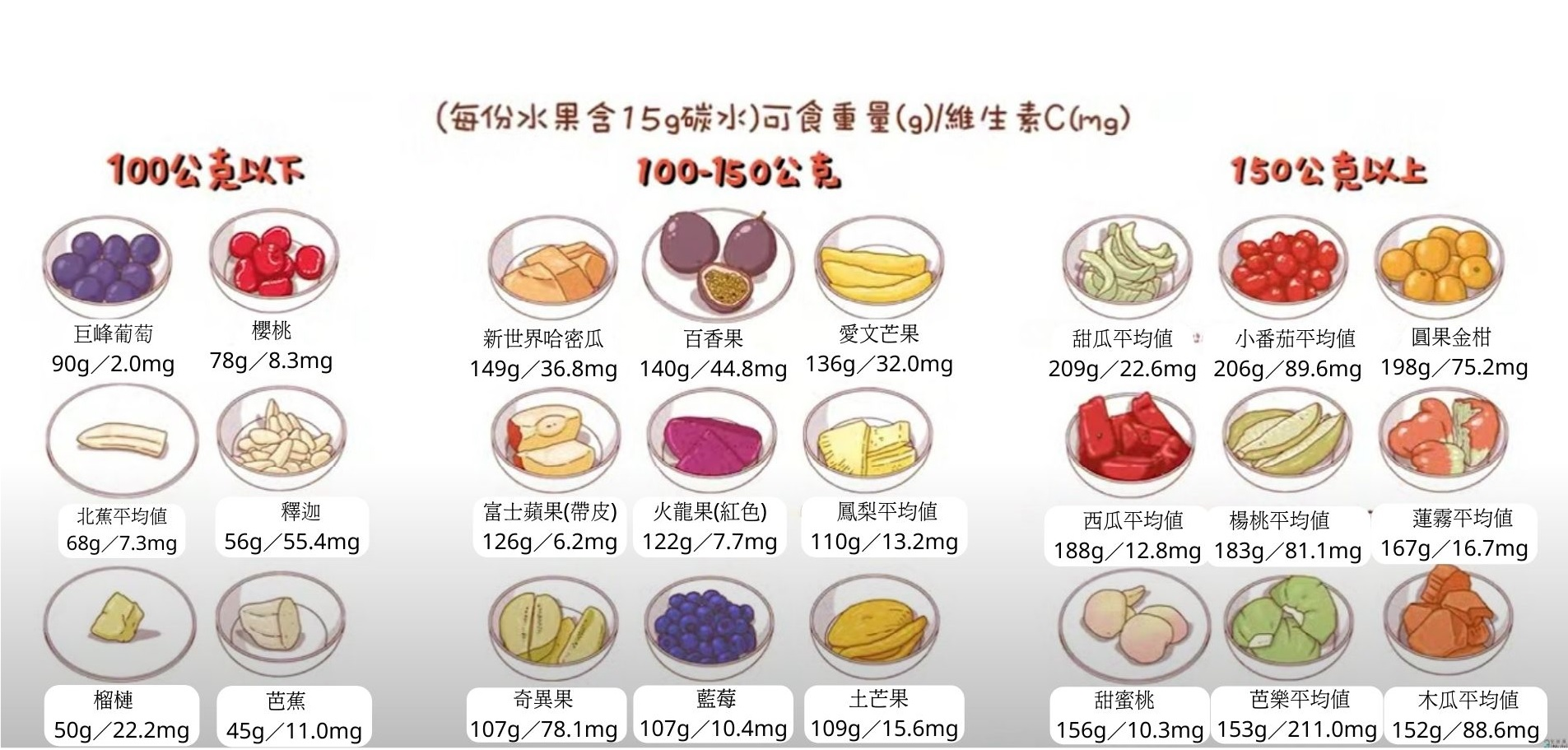 ■可食用100公克以下:這些水果碳水化合物含量比較高,所以能吃的份量就比較少。