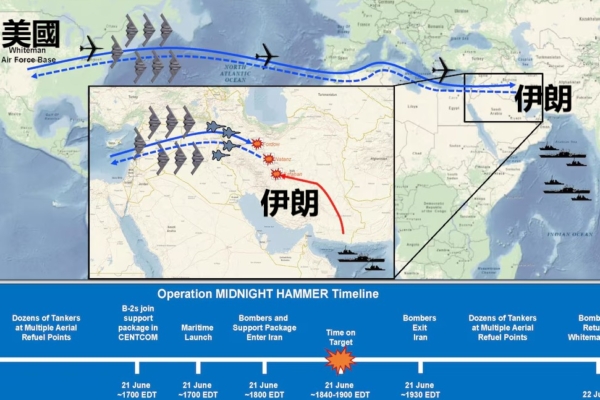 總統川普(特朗普)指揮的「午夜之錘」行動於美東時間上週六(6月21日)下午6:45開始,從密蘇里州惠特曼空軍基地起飛的7架美國B-2「幽靈」轟炸機向伊朗的福爾多地下鈾濃縮設施投下了12枚GBU-57巨型鑽地導彈,使伊朗的核計劃推遲了數年。