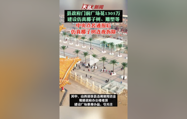 2024年11月,北方的山西太原市清徐縣,投資5.9億元(人民幣,下同)建設縣城水系生態治理及城市停車場惠民工程,但卻違規使用經費維修政府辦公大樓頂樓,還在縣政府門前的城市廣場花1305萬元建仿真椰子樹,椰子在中國是南方的海南島的標誌。在引發爭議後,當地連夜拆除這些景觀建築。