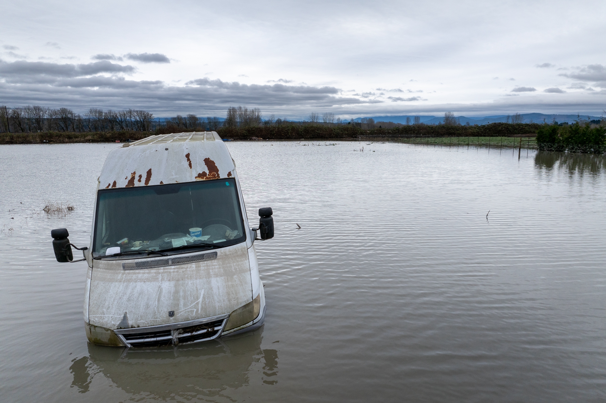 2025年12月14日,華盛頓州斯諾霍米什縣發生嚴重洪澇災害,一輛汽車浸泡在洪水中。(Brandon Bell/Getty Images)