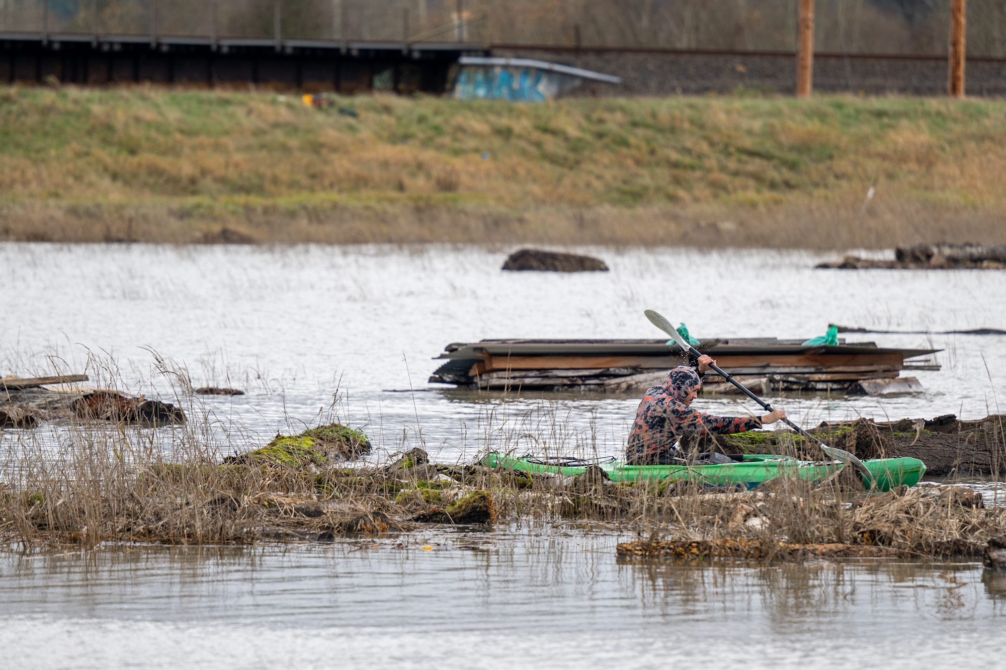 2025年12月14日,華盛頓州斯諾霍米什縣發生嚴重洪澇災害,一名男子划船出行。(Brandon Bell/Getty Images)