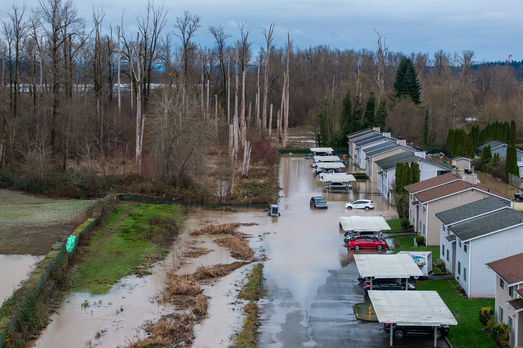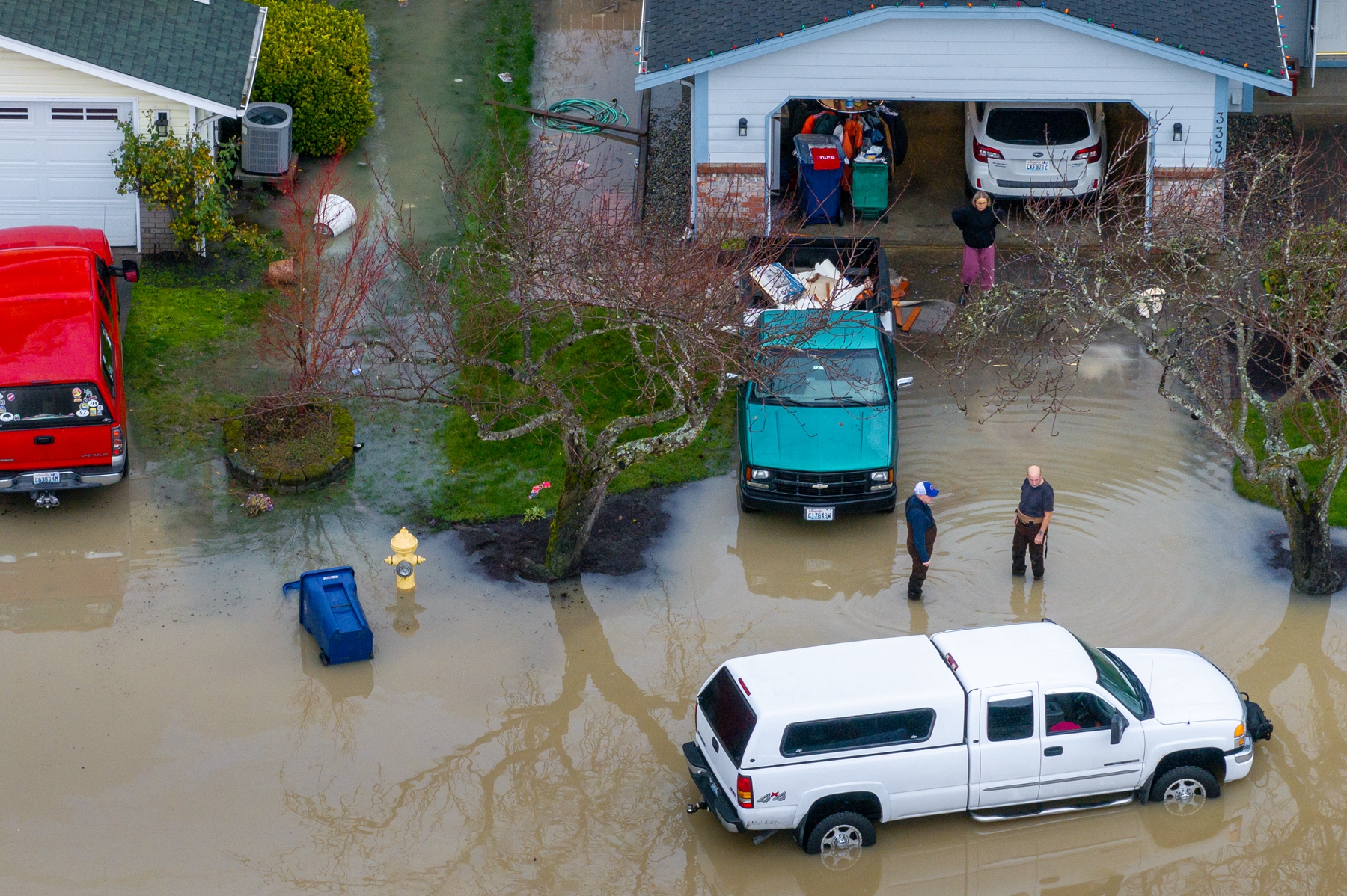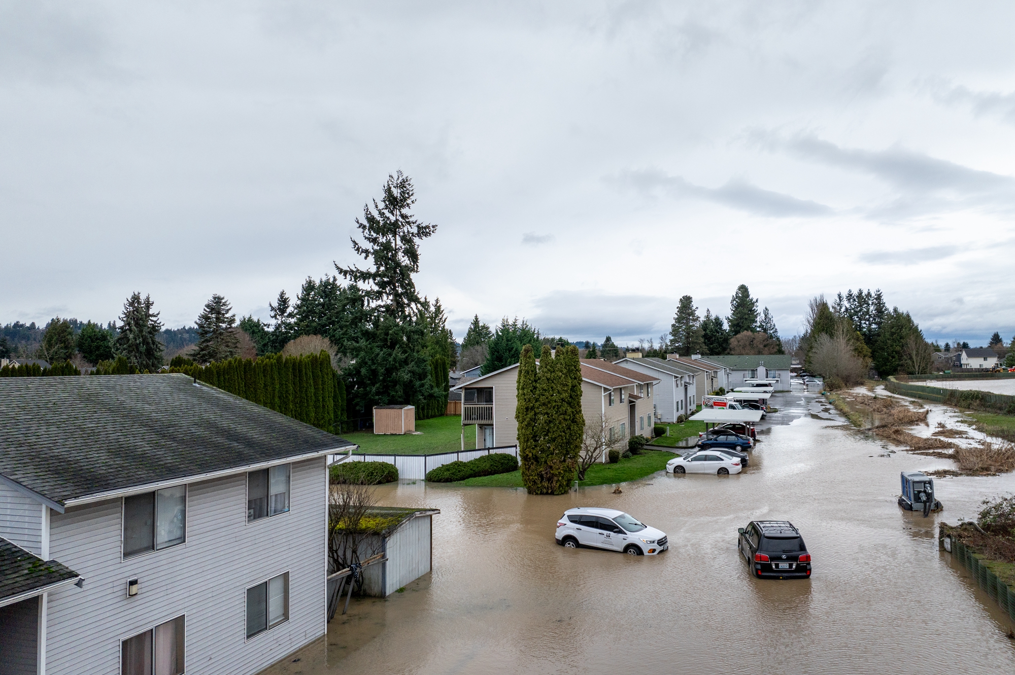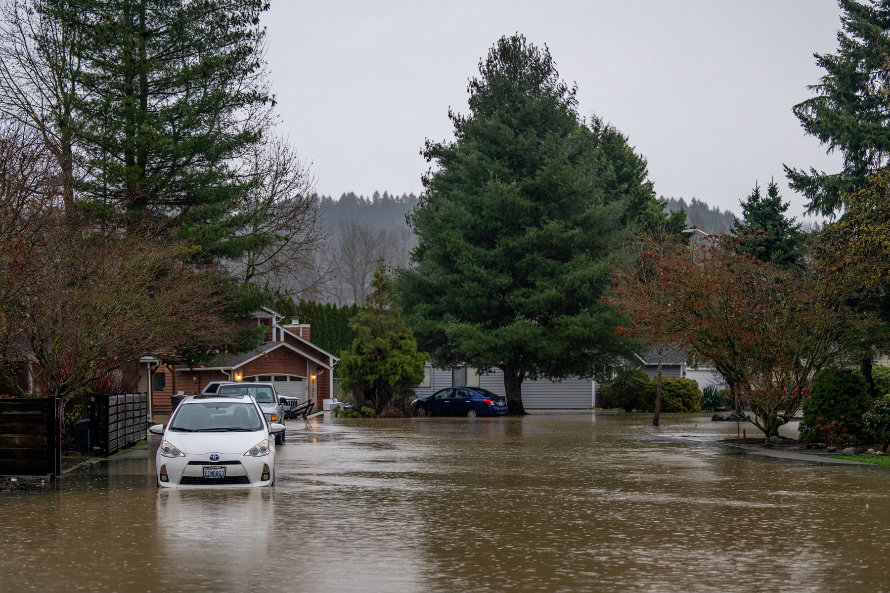 2025年12月16日,華盛頓州金縣太平洋城的一個社區被洪水圍困。(Brandon Bell/Getty Images)