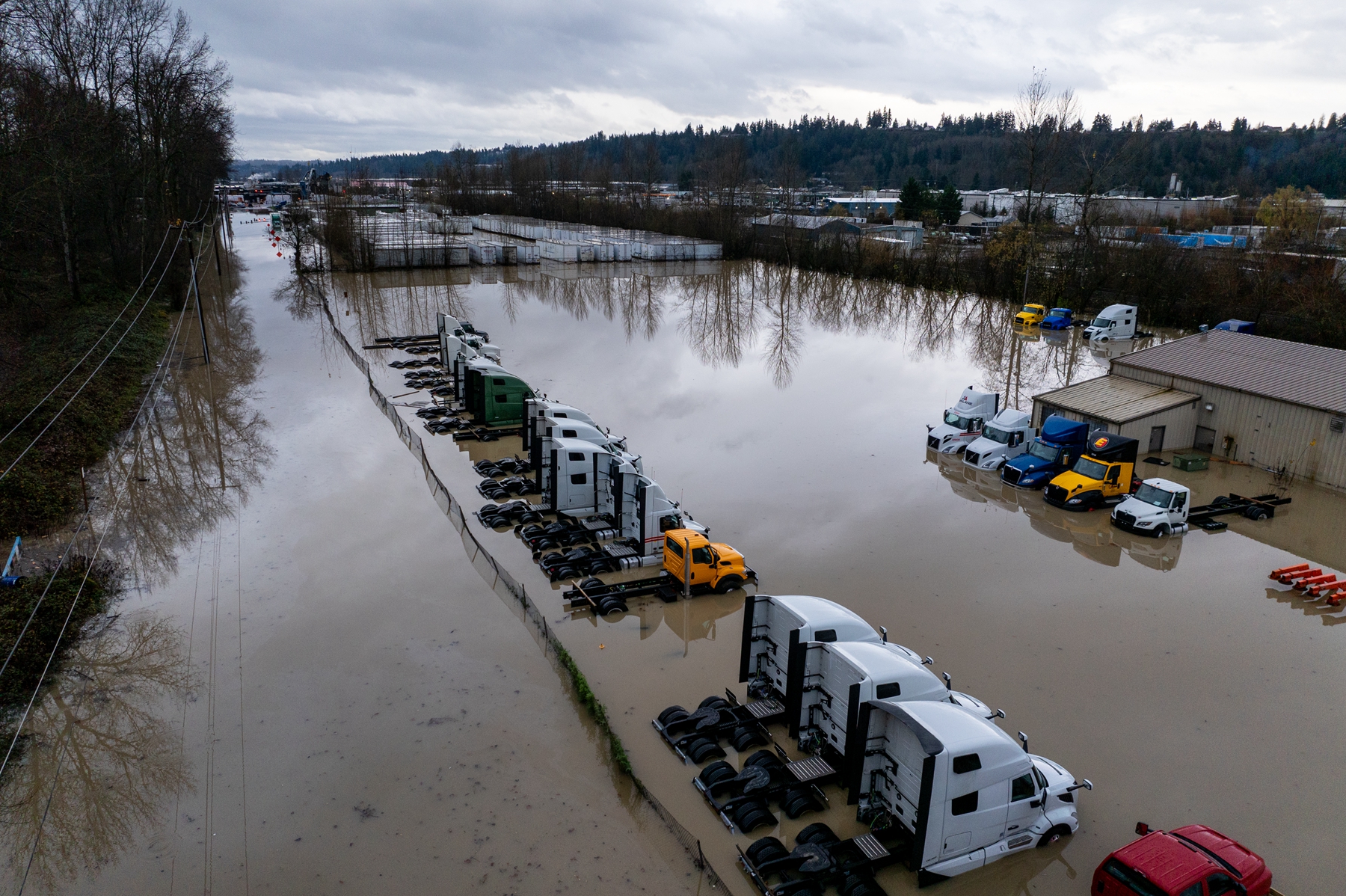 2025年12月16日,華盛頓州金縣太平洋城發生嚴重洪澇災害,許多半掛卡車浸泡在洪水中。(Brandon Bell/Getty Images)