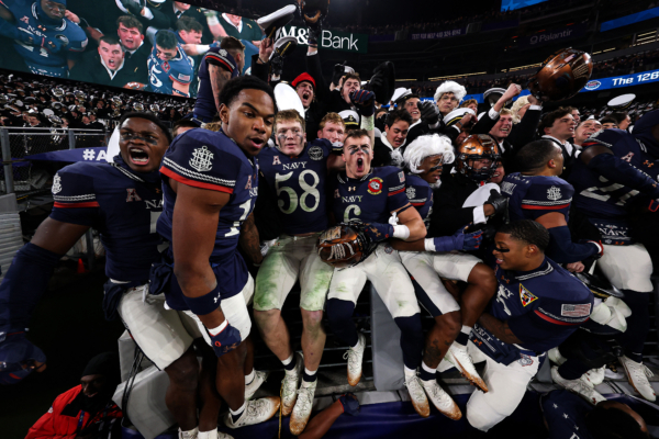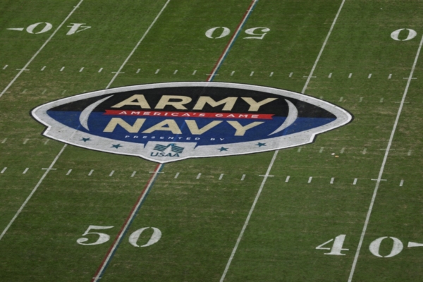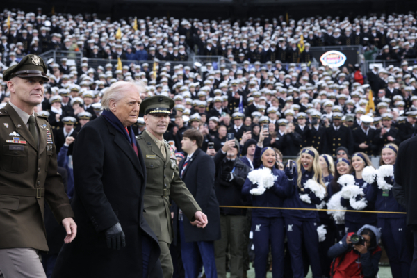 川普隨後前往海軍隊(Navy)場邊觀賽。中場期間,他依序造訪兩隊看台,並向海軍學生拋送「讓美國再次偉大」(MAGA)帽子,之後再前往陸軍隊區域。