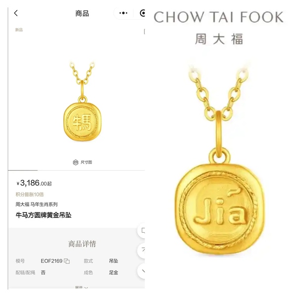 該吊墜2克重,正面刻有正體字「牛馬」圖案,背面則刻著「jia~」字樣。官方小程序仍在售,工費360元(人民幣,下同),售價3186元起,周大福29日金價為每克1413元。
