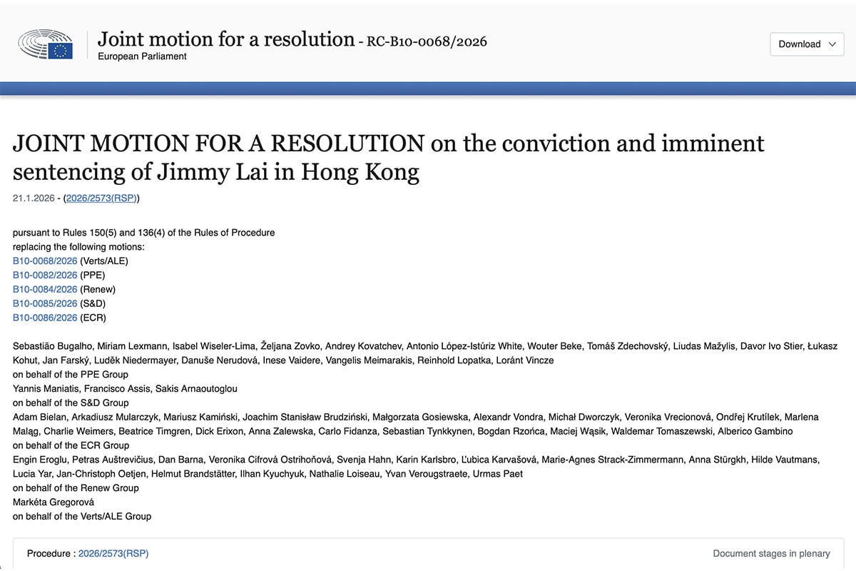 【大紀元2026年01月23日訊】(大紀元記者藍美晶香港報導)歐洲議會於昨日(22日)通過一項針對香港情況的人權決議,強烈譴責香港當局就壹傳媒創辦人、英國公民黎智英的起訴及定罪,並要求立即無條件釋放黎智英及所有因行使基本自由而被拘留的人士。該決議為歐洲議會當日通過的三項人權決議之一。
