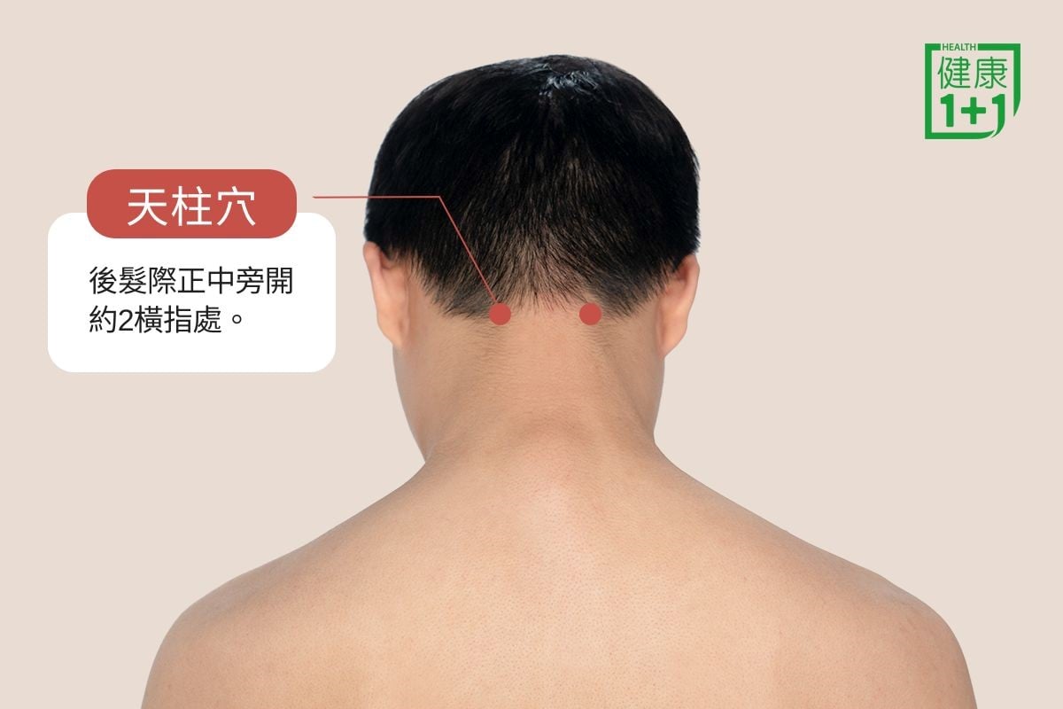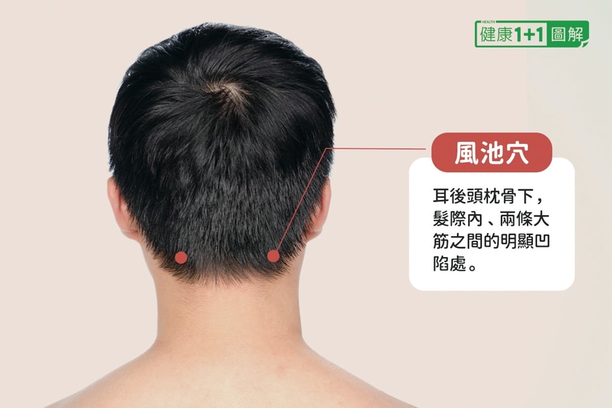 風池穴:耳後頭枕骨下,髮際內、兩條大筋之間的明顯凹陷處。