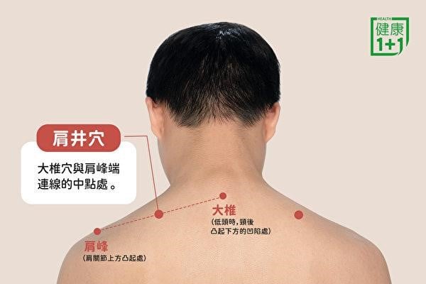 肩井穴:位於大椎穴(低頭時頸後凸起下方的凹陷處)與肩峰端連線的中點處。
