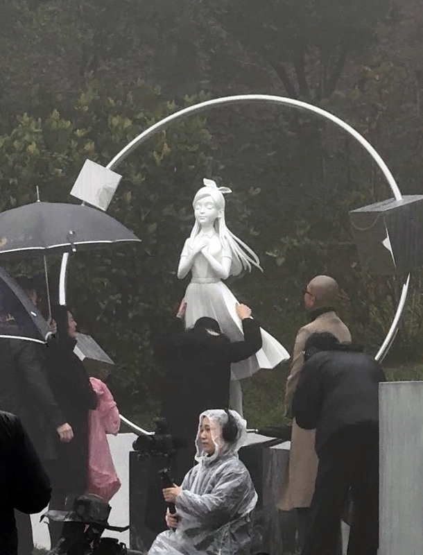具俊曄設計的雕像,是一個優雅的長髮女孩,綁著髮帶穿著洋裝,雙手合放在胸前,雖然閉著眼,但神情安詳,就跟大S生前給人的感覺一樣。雕像外圍還有圓環,上頭掛著三個黑色立方體,加上周圍的立方體一共有九個。