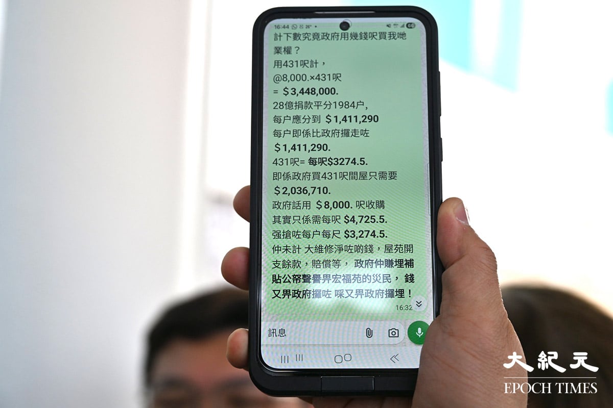 宏昌閣李先生對政府收購計劃的補償安排提出質疑,指當局公布的每呎8千元收購價並非真實數字,實際上政府每戶平均只出資約4千多元,餘下部分來自社會捐款。他更批評,政府把捐款與公帑混同處理,等同「食咗」廿多億元捐款。